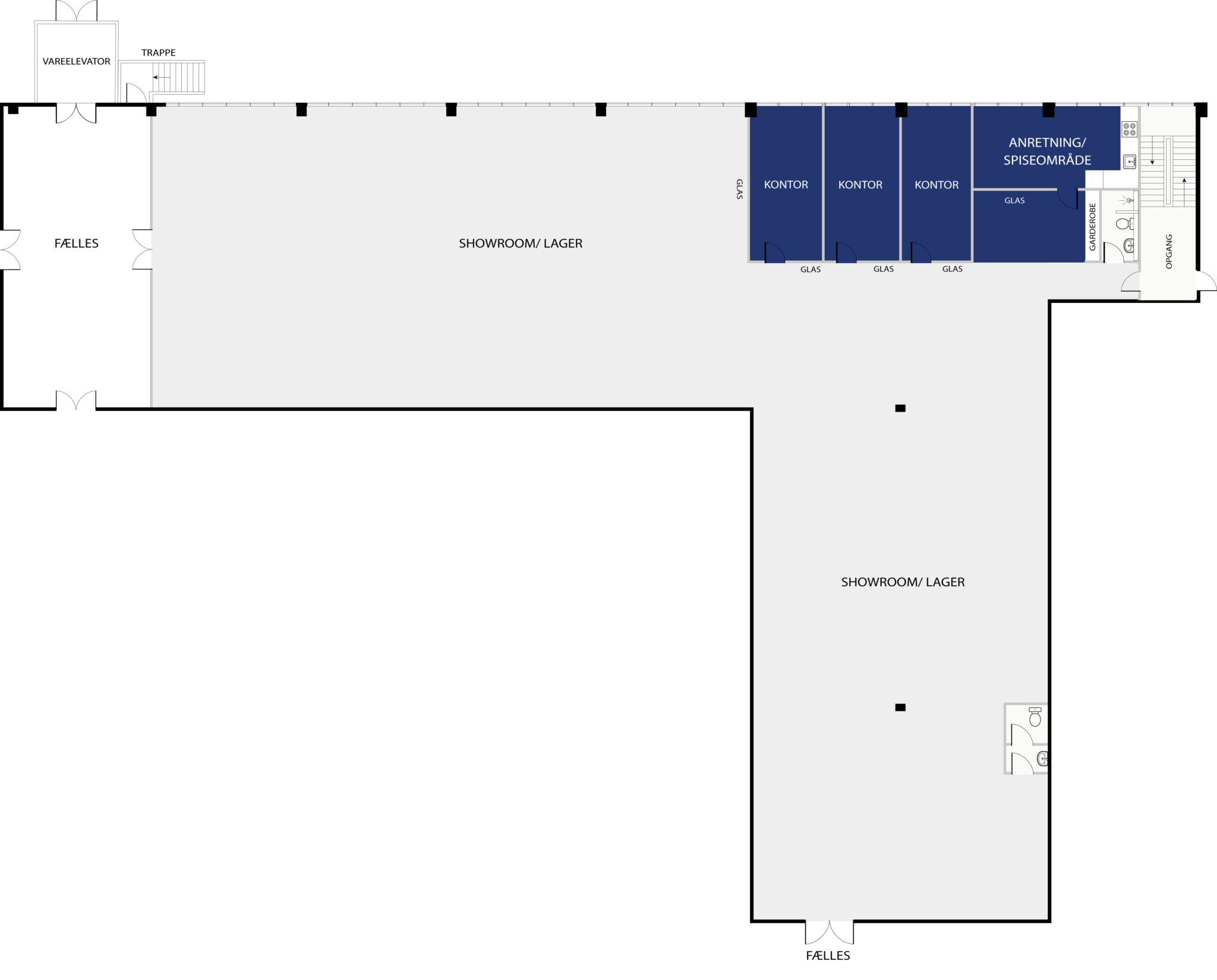 Lejemålet er pt. indrettet med 3 kontorer med glasvægge, nyt anretterrum med spiseplads og toiletter/badefaciliteter. Endvidere stort flot og lyst rum til lager eller showroom.